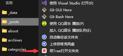 鼠标右键文件夹/空白处,可以选择用Trae打开文件夹
