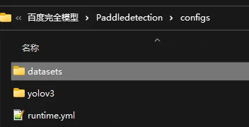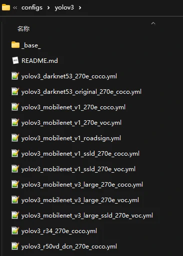 我们这里使用的是yolov3模型,你可以在克隆下来的PaddleDetection的:PaddleDetection/configs/中找到它